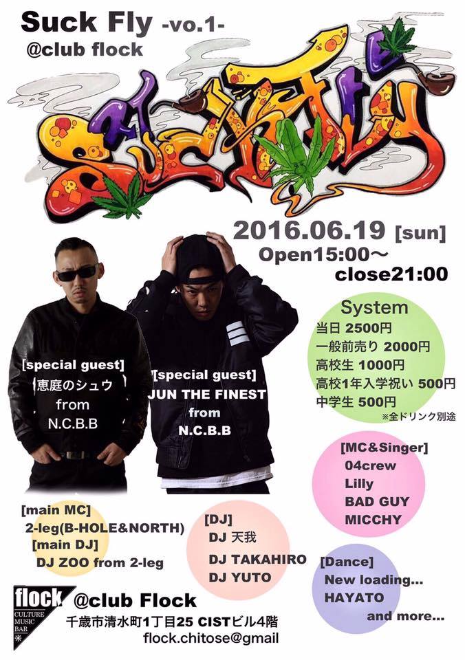 6/19日(日) 千歳@Club Flock にて開催の「Suck Fly(サックフライ) vo.1」に、恵庭のシュウ & JUN THA FINESTが出演!