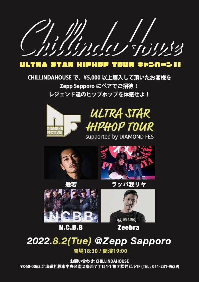 キャンペーン期間中CHILLINDAHOUSE店頭にて、5,000円以上ご購入して頂いたお客様を、8/2(火)Zepp Sapporoで開催の「ULTRA STAR HIPHOP TOUR in SAPPORO」にペアでご招待!