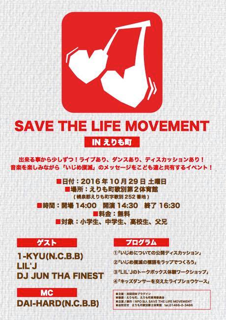 10/29(日) えりも町にて開催の「SAVE THE LIFE MOVEMENT in えりも町」に、DAI-HARD(N.C.B.B), 1-KYU(N.C.B.B), LIL’J & DJ JUN THA FINESTが出演!